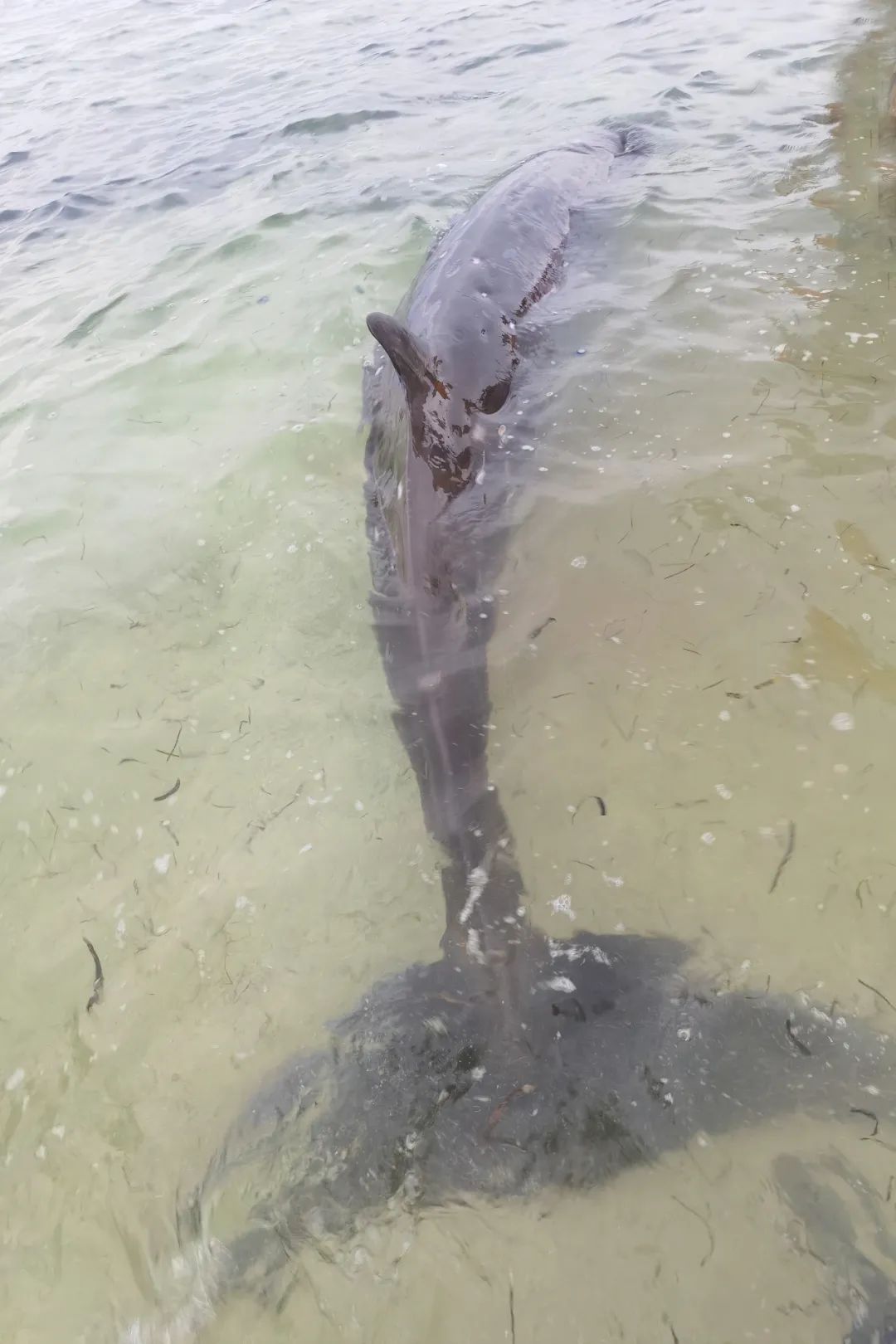 官兵高度警觉,涉水抵近观察。原来是一只大海豚搁浅在礁盘上。“那只海豚呈深灰色,身长约4米左右。它可能迷路了。”杨友义介绍,官兵们发现它还有呼吸,眼睛已经没有精神,身上有几处外皮擦伤。礁盘附近水域较浅,加之白天阳光强烈、温度高,海豚看起来奄奄一息,仅凭自身能力难以游回大海。官兵立即对其展开救助。可由于海豚身体庞大,官兵无法依靠现有力量将其放归大海。大家一边往海豚身上不停的挥洒海水,使它身体保持湿润,一边紧急向值班室报告。随后,该水警区紧急拉动,20名正准备吃晚饭的官兵放下碗筷,火速赶赴现场。