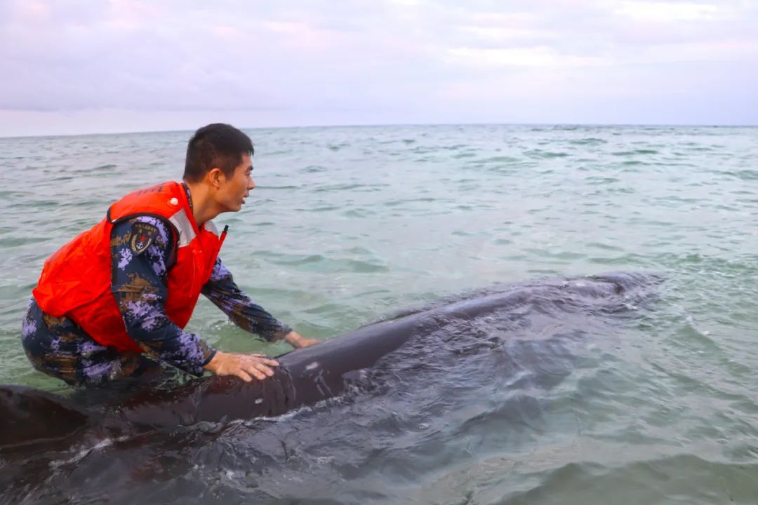 救援官兵身穿救生衣,涉水向搁浅海豚走去。考虑到搁浅海豚附近礁盘很大,大型船只无法驶入。为保障安全,他们协调三沙市政府和海警局备便海警船、气垫艇增援。深水区离岸边较远,救援官兵在齐胸深的海水艰难跋涉30多分钟才接近深水区。官兵们缓缓放下海豚,将其推向深水区。 “海豚是智商很高的动物,它们可爱、聪明、善良。”杨友义介绍,获救的海豚可能心怀感激,在深水区依依不舍不肯离去。官兵返回后,海豚借助潮流又向官兵游过来,导致再次搁浅。 “傻瓜啊,为什么回来?走啊,走啊,别往回游了!加油啊!”战士肖浩磊深情地说。最后,官兵们只好用海警部门的船只,拖着海豚至深水区。 经过近2个小时的共同努力,大家终于将海豚放归大海。“正月十六月儿圆,海豚也可以回家和‘亲人们’团圆了。”杨友义的一番话道出官兵们的心声。月亮爬上夜空,皎洁的月光照在官兵们脸上,有一种特别的美。美丽西沙我守护,生态环保爱如家。该水警区领导介绍,一直以来,水警区党委始终引导官兵将生态环保理念贯穿守岛、建岛的全过程。他们每年都开展“爱舰、爱岛、爱海洋”专题教育,增强官兵的海洋意识;每月进行营区绿化,植树种草,向渔民和外来人员进行环保知识宣讲,强化人员环保意识;每周组织一次“爱岛日”,及时清除海洋垃圾。日常工作生活中,官兵们以救助野生动物为己任。仅去年一年,救助的海鸟就有上百只,海龟20多只,美丽的西沙呈现一幅人与自然和谐共生的大美画卷。