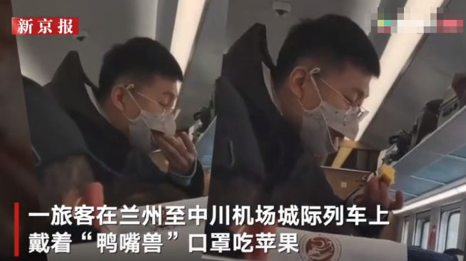 1月12日,一旅客在兰州至中川机场城际列车上,戴着“鸭嘴兽”口罩吃苹果。新京报记者从中铁兰州局兰州客运段获悉,当日并未有乘务员发现该情况,视频中旅客乘车时所戴口罩不符合疫情防控乘车规定,如乘务员发现后,会提示其更换口罩或发放应急口罩,车厢内虽未明确禁止乘客饮食,但乘务员也会及时提醒。铁路部门提醒:乘车时需佩戴合规口罩,尽可能不要在车厢内饮食!