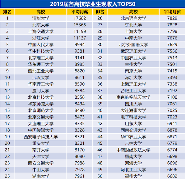 清华大学高居第一 与高考录取分数、大学综合实力等排行榜一样,在平均月薪方面,清华大学继续着在国内高校圈的领先地位。上述榜单显示,清华的2019届毕业生,在离校一年后,平均月薪为17682元,高居第一,比排在第二位的北大2317元,这很好地说明了理工科优势校整体薪资水平要高于人文社科优势校。 上海交大、浙大薪资水平相当 排名薪资榜第3和第4位的高校分别是来自“华东五校”中的上海交通大学和浙江大学,平均薪资均在万元以上,且非常接近(相差62元),这与两校的优势特色和毕业生主要就业地域相近有很大关系。 在前10强中,除了上海交大和浙大外,华中科技大学、北京理工大学、华东理工大学、西北工业大学等理工类头部学府,成为了高薪人才的摇篮。中国人民大学则是唯一一所以人文社科类专业见长的高校,再次说明人文社科类专业毕业生在当下社会中薪资待遇不如理工类,这也是为何高中生能选理科就不要读文科的最主要原因。 武大、南大薪资排名悬殊 在这份榜单中,有着“中国最美大学”称号的武汉大学,2019届毕业生平均月薪令人意外地搭上了10强末班车。比这更让人意想不到的是南京大学的排名,竟然仅处于第34位。要知道,从生源质量和综合实力上来看,南大整体要优于武大。 三所非“双一流”大学入围前50 虽然整体上“双一流”大学的平均月薪优势明显,但在前50强中,依然出现了3所非“双一流”大学身影,它们分别是北京语言大学、深圳大学和上海理工大学。值得一提的是,这三所高校均位于一线城市,其毕业生绝大多数都留在本地就业,这一因素与毕业生平均月薪的高低有着直接关系。 多所名校榜上无名 细心的小伙伴可能已经发现,复旦大学、中国科学技术大学、哈尔滨工业大学、同济大学、北京航空航天大学等多所985工程、世界一流大学建设高校榜上无名。在笔者看来,并非这些高校毕业生平均月薪无缘前50名,而是未纳入排名统计范畴。在211工程、世界一流学科建设高校方面,一贯以毕业生“多金”著称的上海财经大学、中央财经大学、对外经济贸易大学(两财一贸),同样没有看到身影。 总的来说,高校毕业生的薪资水平与其所学专业特性、就业行业、地域等多个因素相关,并不能完全等同于高校的综合实力。