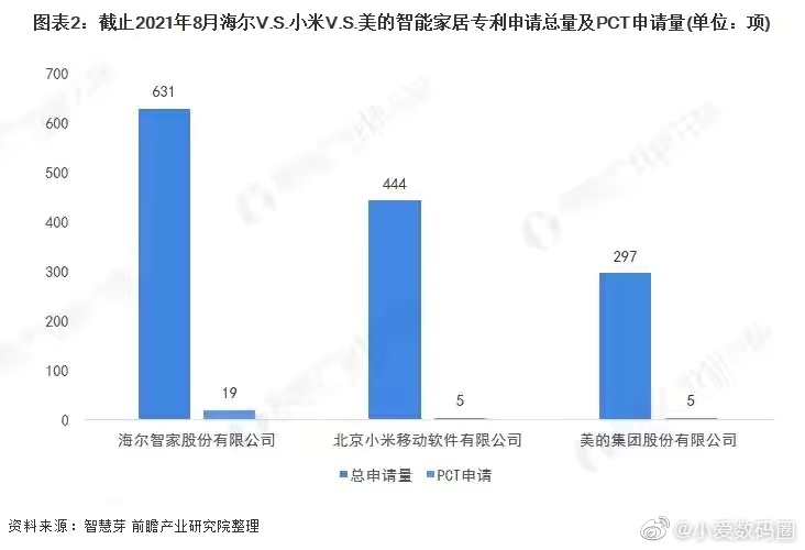 同时,该机构还发布了三巨头专利申请量数据,海尔最多,有631项,小米专利申请量位列第二,有444项。相比之下,美的为297项,略少一些。个人感觉,未来小米一定会成为是国内智能家居行业绝对的第一,你认同吗?