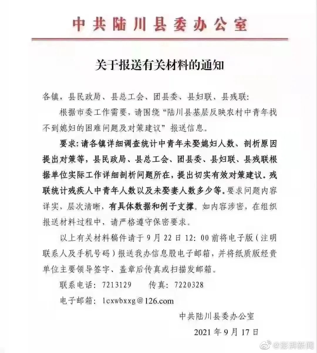 近日,网传一份广西玉林陆川县的通知显示,陆川县要求各镇以及县民政局等单位统计中青年“未娶媳妇”人数,并剖析原因,提出对策 。近日,该通知引发热议,通知的发布者陆川县委办公室回复媒体称,该通知材料属实,是一份内部通知。对此,有专家表示,这种现象与女性婚恋价值观的进步密切相关,加强农村地区的基础设施建设,为农村留住人,或为一种解决现有困境的办法。此外,针对这份通知,专家希望陆川县在统计未婚男青年人数的基础上,能够认真对结果进行研判,找出可行的解决办法。