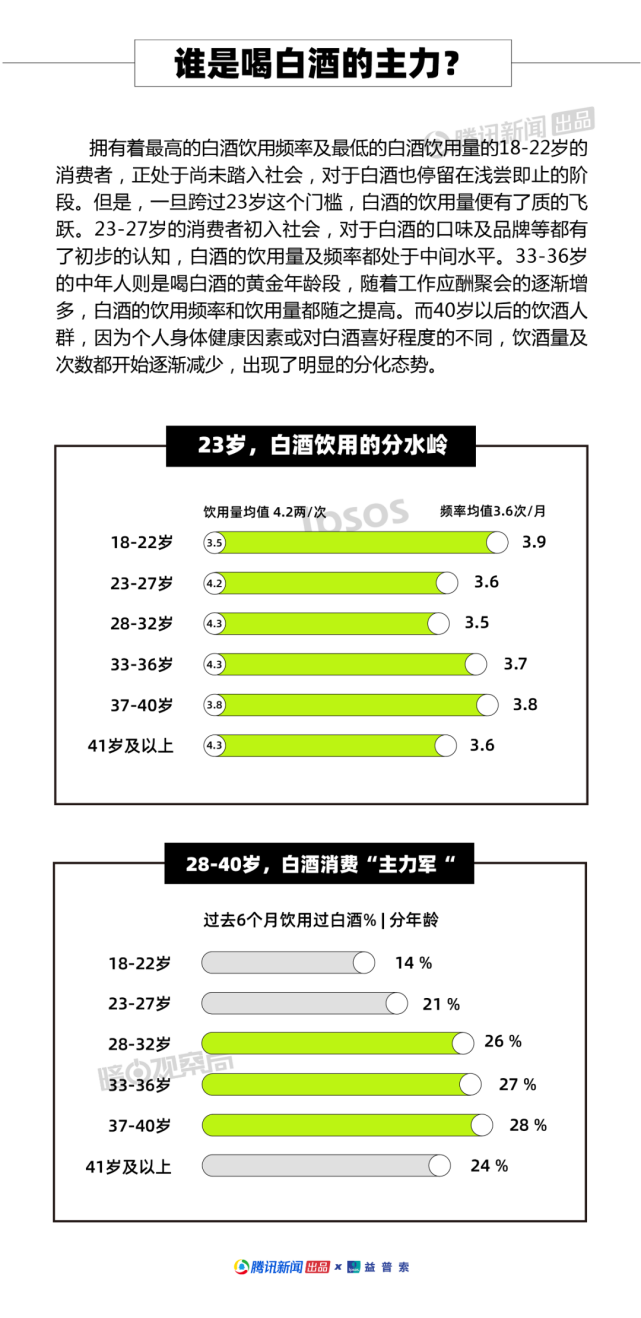 在去年新冠疫情的冲击下,全国范围内人员流动受限,聚集性消费场所限流,市场消费活动减少,为白酒行业带来了不可避免的影响。 随着疫情防控的常态化,社交条件放宽,国内的白酒市场也呈现出复苏反弹的态势。根据调研数据,全国大概每4个人中,就有1个人在过去的半年内饮用过白酒。并且有33%的消费者认为,相较于去年,今年的白酒饮用次数有所增长。 腾讯新闻出品X Ipsos益普索 X 暗中观察局联名发布《2021年中国白酒消费洞察报告》,覆盖全国31个省份(不包括港澳台)的1-4线城市,从白酒饮用者的地理位置、年龄、饮用场景和购买行为与态度四个方面,对中国的白酒消费人群进行了全方位的洞察调研。 中国的白酒市场依旧面临大量需求,整个市场正凸显出复苏反弹的态势。 年轻人正处于一个不断尝试,寻找适合自己的白酒的阶段。品牌应抓住机会点,积极走进年轻消费者的内心世界,开发出符合年轻消费者消费习惯的产品。 如何“吸引”年轻消费者与如何“留住”老消费者将是各大白酒品牌需要考虑的主要问题之一。 虽然目前聚会&应酬两大场景“平分秋色”,但应酬的场景依旧是白酒品类发展和消费升级的机会点。