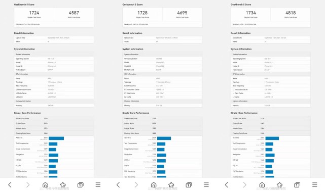 在发布会前,各种精准爆料的狂轰滥炸,已经让我们对iPhone等新品有了大概的了解。 再加上果子哥这几年一直在挤牙膏,每年的迭代是肉眼可见的保守,大家的期待值自然就没那么高了。 毕竟苹果又不会突然来个50W快充或者干掉刘海,这对于库克来说都是激进行为,不值得。 图片 除此以外,苹果喜欢隐藏细节和玩文字游戏的传统,也会让看发布会的人一知半解。 即使是内存和电池容量这种普通参数,苹果也不会明着告诉你。 你只能看到“相比上一代,iPhone 13续航提升了xx”这种不够直观的对比。 真想扒出详细的内存和电池容量数据,我们只能事后去官网找,或者查工信部入网信息。 图片 本着负责良心的态度,小雷决定帮大伙扒一扒,库克在发布会上,没有透露过的那些阉割、细节和文字游戏。 希望能借此帮大家更好地挑选新机。 芯片 先从芯片说起好了,iPhone 13全系全系A15芯片,本来是挺正常的事儿。 但果子哥没有告诉你们,即使是同一款芯片,四台机型的性能也是存在差异的。 今天小雷一早起来,就看到iPhone 13的GeekBench跑分曝光。 先看看CPU跑分: iPhone 13:单核 1724 分,多核 4587 分; iPhone 13 Pro:单核1728 分,多核 4695 分; iPhone 13 Pro Max:单核1734 分,多核 4818 分。 从三款机型的CPU单核和多核跑分来看,性能基本处于一个水平线。 重点来了,A15的主频提到了3.23Ghz,比单核频率3.2Ghz的M1芯片还高一丢丢。 听起来强如吕布,单挑三个骁龙888都不在话下,仿佛达到无人之境。
