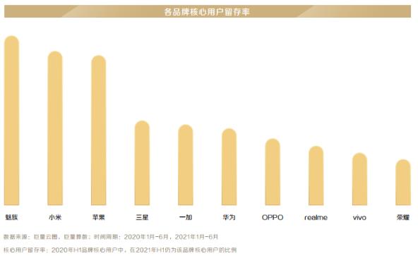 此外,核心用户是品牌的坚定拥护者,是否能够稳定核心用户,对于品牌发展至关重要。 2021年上半年,魅族拥有着最为稳定的核心用户,留存率居行业首位。然而受制于存量用户规模,魅族当前的任务是扩大用户规模。 除魅族外,小米与苹果的核心用户留存率也处于行业头部。与魅族不同的是,在大体量用户加持之下,小米与苹果有着更为良好的发展态势。