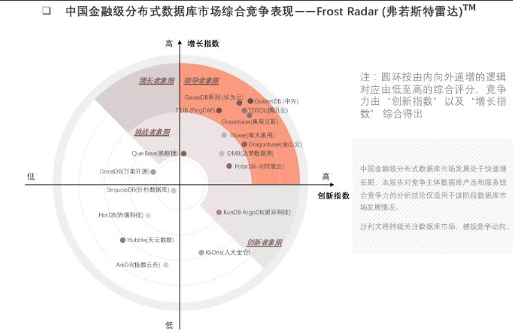 近年来,随着中国数字科技的突飞猛进,传统由欧美数据库一统天下的局面已发生改观。特别是国产数据库在金融领域发力明显,并逐步完成市场布局,因此该领域正呈现出分层加快、产业格局有望提早形成的势头。 近日,Frost&Sullivan联合头豹研究院发布了《2020年中国金融级分布式数据库市场报告》,报告首次从创新指数和增长指数两个维度对中国金融级分布式数据库行业进行了不同梯度划分。其中,以中兴通讯GoldenDB分布式数据库为代表的少数品牌被评为“领导者”,彰显出金融市场对国产数据库的肯定与信心。