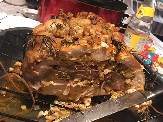 Turducken(特大啃) 这个菜还是比较有创意的,先用一只巨大的火鸡,然后塞进去一直鸭子,接着往鸭子里面塞进去一只鸡,然后鸡肚子里塞香肠和熏肉,慢慢的油炸或者烤大约1-2个小时才能做成,在美国盛大的节日里可以看到,不得不说这道菜创意无穷,当然也是热量极高。