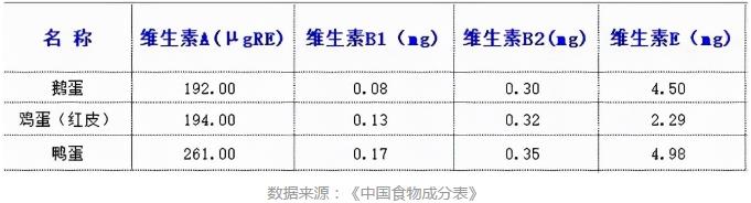 很多人认为,肯定是鸡蛋最有营养,因为平时吃得最多,事实真的是这样吗? 口说无凭,让我们来看下「CCTV生活提示」栏目的一项检测数据,工作人员特意选择了一批鸡蛋、鸭蛋、鹅蛋,送去北京食品安全监控和风险中心进行检测,结果最终显示:三种蛋类当中的蛋白质、微量元素和各类矿物质等营养成分相差无几。 蛋白质 检测结果显示,三种蛋类当中的蛋白质差不多都在13g/100g,与《中国食物成分表》上显示的数据(12-13g/100g)基本一致。 维生素 三种蛋类在维生素A、B1、B2、E方面的数据,并没有什么太大的差别,有差的话也都在微克和毫克之间,可忽略不计。具体如下: