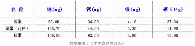 矿物质 在矿物质方面,鸡蛋的钠含量最高,鸭蛋的钙含量最高,鹅蛋的铁和硒含量略高于鸡蛋和鸭蛋。具体数据如下: