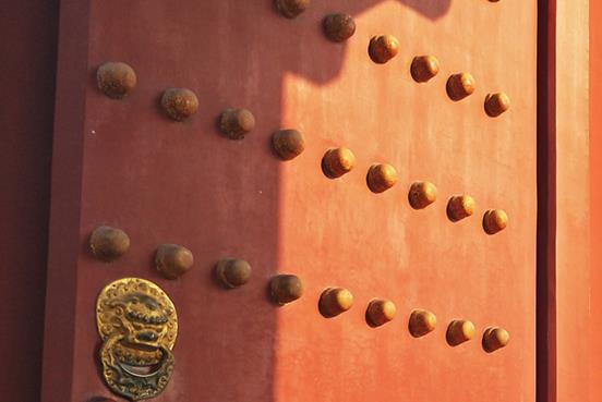 古时,门钉被称为“浮沤钉”。浮沤,指的是水面上的气泡,以此来形容门钉与大门的连接,犹如气泡漂浮在水面上一样。最早的门钉要追溯到春秋战国时期墨子所说的“涿戈”,外形为尖圆形,长约二寸,钉入门板内约一寸,主要用来防御外敌。后来随着外形的改变,门钉逐渐变成了装饰之物。 门钉在实榻门中较为常见。实榻门是由若干块厚木板拼装而成的平整实心面板大门,属于板门的一种,也是板门中体形最高、重量最大、防御力最强的门扇。通常这种门专用于宫殿、坛庙、府邸和城垣等建筑上。实榻门的板与板之间通过龙凤榫或企口缝进行拼接,再用穿带将木板连成整体,以达到加固的目的。具体做法为,先在门板的侧面开通孔,再用穿带将各个门连接成整体。 但在长期、反复的开合中,很容易造成穿带与门板之间的连接发生松动,使得穿带从门板的孔洞中脱落,最终导致门板散架。这时候,门钉便派上了用场。将门钉钉入门板与穿带的连接位置,能起到一定的约束作用,防止门板与穿带错动,从而使实榻门更加稳固。 在组装实榻门时,要考虑门钉的路数来确定穿带的数量及位置,穿带需避开门钉。建筑物的等级决定了门钉的路数,可分为五路、七路、九路等,等级越高,门钉的路数越多。门钉的路数也决定了门钉的直径和高度,比如五路门钉的间距是3个门钉的直径,七路为1.5个门钉的直径,九路为1个门钉的直径。 随着建筑技术工艺的不断提升,门板之间的连接也不再需要门钉了,只需将细小的腰串木插入木板之内,即可确保门板连接的牢固性。因此之后在大门上安置的门钉,大多是为了装饰之用,如在故宫、天坛等皇宫、园林和坛庙建筑大门上的门钉,都是为了美观。 虽然我们现如今看到的建筑物上的门钉不再属于功能构件,但古人发明门钉的智慧确实令人钦佩。