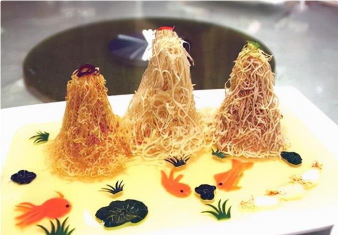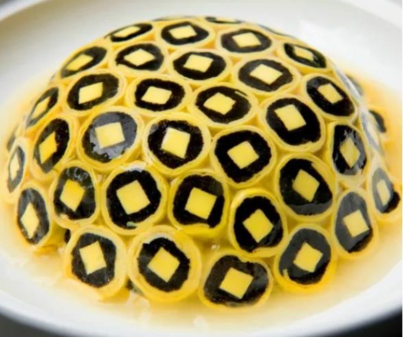 金钱发菜 金钱发菜是陕西地方独有的名菜,始于唐代。相传唐代商人王元宝嗜食发菜,不可一日无此君。后来王元宝成为富可敌国的大富翁,人人都认为那是因为他常吃发菜的缘故,竟起而效之,并令厨师将发菜做成金钱的形状,暗喻着“发财致富”,讨个吉利,每办大宴必上此菜,金钱发菜因此而名闻四海。