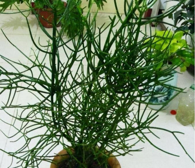 滴水观音这个是比较有名的,有毒的观叶植物了,因为它的植株比较漂亮,在家里养护得还比较多,但是滴水观音它的毒性真的非常大,经常在报道中见到有滴水观音中毒的新闻,之前就看到一个人在公园中遇到大雨,就用牙齿咬下滴水观音的一大片叶子来挡雨,结果下山之后就住医院了,因为滴水观音的汁液已经造成了中毒的现象了,而且中毒还比较严重,滴水观音的茎干比较白,比较漂亮,如果养在家里难免会有一些宠物呀,一些孩子呀,不小心去咬上几口。而且它滴下来的水还是有毒的,这种植物建议大家不要养在家中了,即使它非常漂亮,也不要用手去碰它的汁液或者误食。如果喜欢的话,可以养在家里放在高处里,只许看不许碰。 第二、光棍树