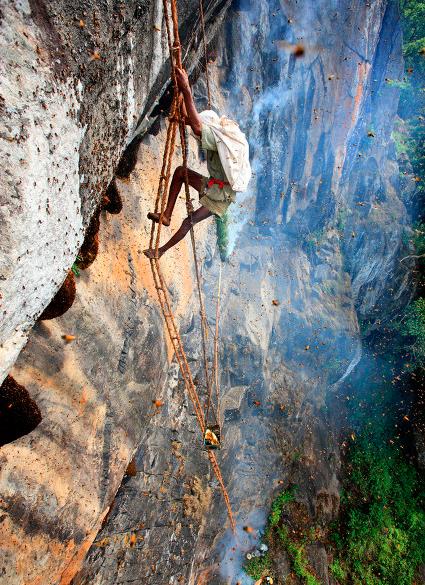 第七名:(尼泊尔采蜜人)在尼泊尔深山万丈悬崖上有一种拥有致幻魔力的蜂蜜,这种蜂蜜里带有一种“侵木毒素”的成分,只吃一小口会让人感到浑身轻松,甚至让你感觉不到疼痛;如此珍贵的蜂蜜,是让人上瘾的美味,也是致命的毒药;为了生存古隆族的男人们世世代代从事着采蜜人这项危险的工作,他们每年只会采摘两次,因为实在是太危险了,采蜜人没有任何安全的保护,仅带着一层薄纱和一条绳梯在百米的悬崖上被数十万只巨大的蜜蜂包围,去采摘蜂巢,一不小心摔个粉身碎骨也是经常发生的事!