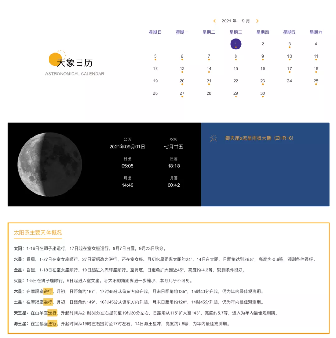 打开9月的天象月历,你会发现,木星在逆行,土星在逆行,海王星在逆行,就连天王星从8月20日起也从顺行改为逆行,太阳系八大行星中体积最大的三个竟然都在本月逆行。这究竟意味着什么呢?