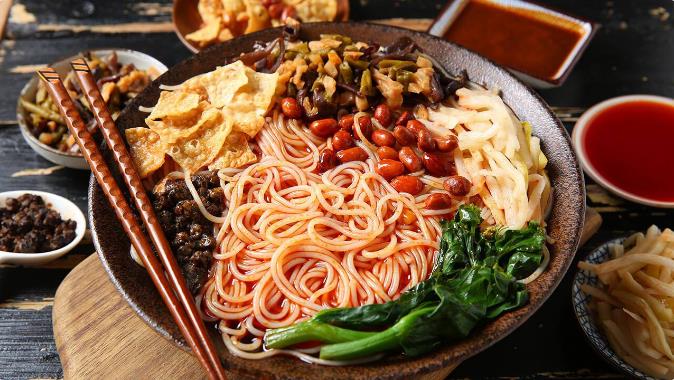 酸辣粉是四川、贵州一带比较有名的小吃,主要特色是麻辣鲜香酸,看似油多,但却不腻。粉条要劲道滑弹且爽口。酸辣粉制作看似简单,但其实有很多讲究,比如辣椒要用“子弹头”“二荆条”“灯笼椒”等等,几种辣椒配合,让辣味不那么单一,不仅辣还要香,味道厚重。 关于酸辣粉的来历,还有一个历史典故,据说张飞、关羽、刘备桃园三结义之后,桃园的主人用红苕粉做主料,再配上特辣的小尖椒,和老坛酸菜以及红糖与黄莲在里面,寓意三人友情绵长,能明白世间的酸甜苦辣。 二、湖南米粉