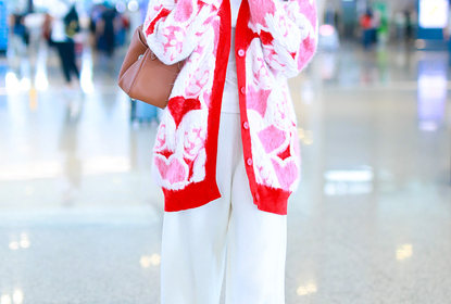 何穗现身机场。她穿艳红毛衣衬绝佳肤色美成风景线,长发飘飘走路...