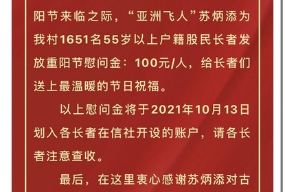 苏炳添在重阳节前回到老家广东省中山市古镇镇古一村,特意为...