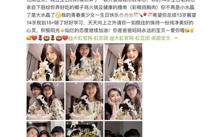 翁虹在微博分享为女儿小水晶庆祝14岁生日的照片,并透露女儿在她...