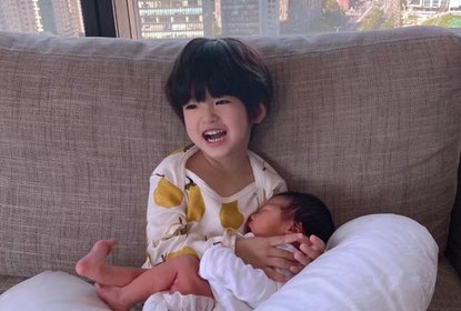 麦迪娜在个人社交账号晒出儿女合照。照片中丹尼尔怀抱着妹妹坐在...