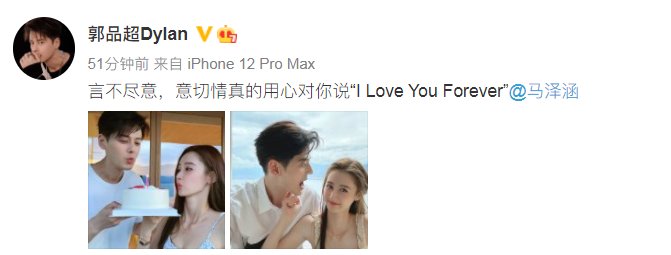 郭品超、马泽涵在微博晒合照公开恋情,写道:“言不尽意,意切情...