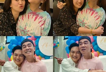 袁咏仪在微博晒出应采儿陪自己庆生的照片,两个人模仿张智霖过生...