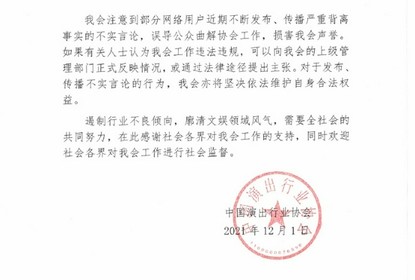 中国演出行业协会在微博发布声明,声明称:“我会注意到部分...