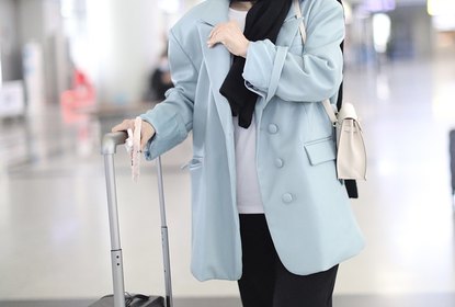 吴昕现身长沙黄花机场,她戴着黑色毛线帽,身着天蓝色超长西服和...
