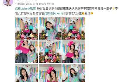 蒋丽莎在微博晒出九宫格为长女陈雅薷庆生。照片中,陈雅薷穿着色...