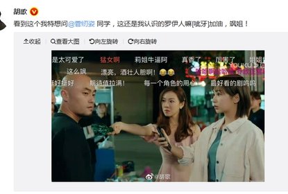 胡歌晒出一张菅纫姿在《女心理师》中拎瓶子要揍人的截图,帮菅纫...