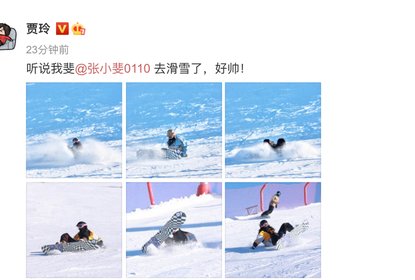贾玲在微博晒出张小斐滑雪翻车照,并表示“听说我斐去滑雪了,好...