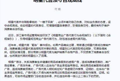 近日,浙江省市场监管局制定印发了《明星商业广告代言行为合...