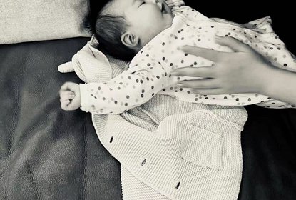 朱珠晒出了与两个月大的女儿王珠宝互动的照片,照片中的宝宝双手...