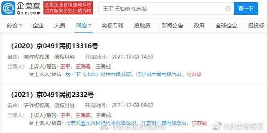 近日,汪苏泷等新增开庭公告信息,原告为王洛宾后人王平等,...
