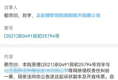 因网络侵权责任纠纷,INTO1成员刘宇起诉黑粉蔡某。公告详情显示...