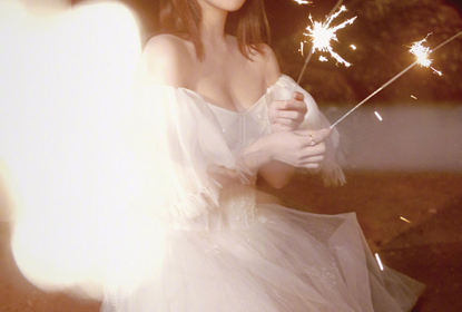 杨紫在微博晒出海边沙滩烟花大片,照片中的她身穿白色露肩公主纱...