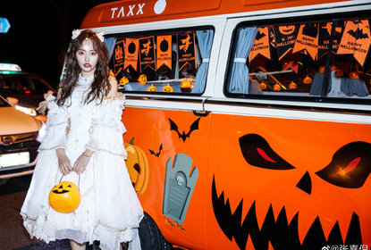 张嘉倪在微博晒出自己的万圣节造型,她身穿白色洛丽塔公主裙cos...