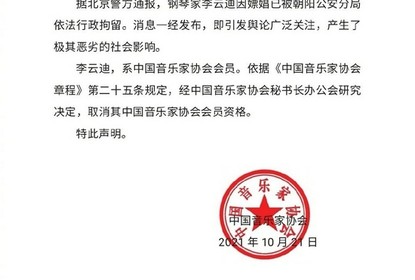 李云迪嫖娼被拘事件后,中国音乐家协会发布声明取消李云迪会员资...