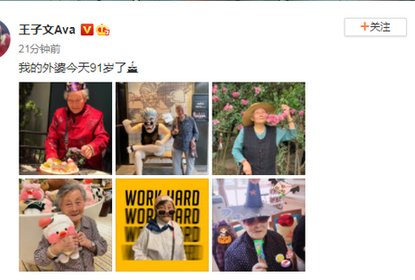 王子文在微博为91岁的外婆庆生:“我的外婆今天91岁了!”并分...