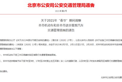 北京市交管局官网发布《关于2021年“春节”期间调整本市机动车和非
