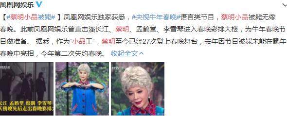 近日,有媒体爆料蔡明小品在春晚终审中被毙,将无缘央视牛年春晚