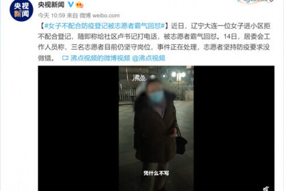 近日,辽宁大连一位女子进小区拒不配合登记,随即称给社区卢书记