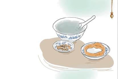 先来看这样一段:“豆汁儿焦圈儿斗香菜儿,油煎灌肠淋(līn)烂蒜