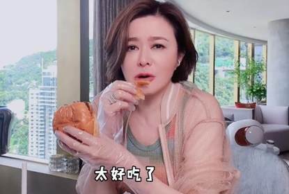 关之琳在社交平台上晒出一段吃饭视频,当天她手拿汉堡炸鸡大快朵