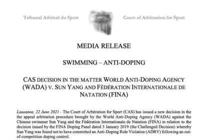 22日,位于瑞士洛桑的国际体育仲裁法庭宣布,对中国游泳运动员的...