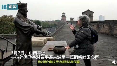 山西平遥,一位外国游客对着平遥古城里一尊铜像吐露心声,她十分