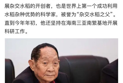 获悉,“杂交水稻之父”、中国工程院院士、“共和国勋章”获得者袁隆