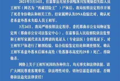 4月30日,西藏嘉黎县公安局发布关于王相军尸体检验结果的通报,