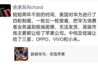 余承东:制裁让华为手机无法发货,高端让给了苹果 中低端让给了O