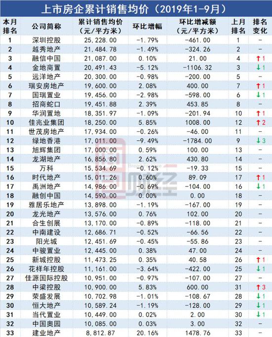 33家上市房企累计销售均价排名如下: