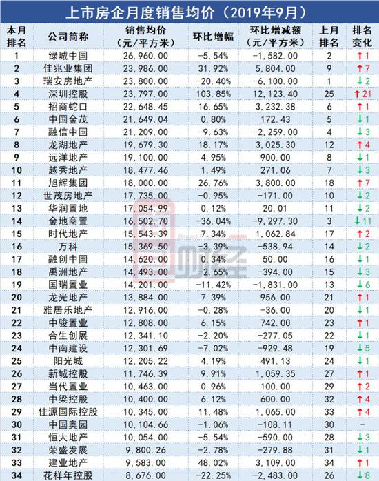 34家上市房企单月销售均价排名如下: